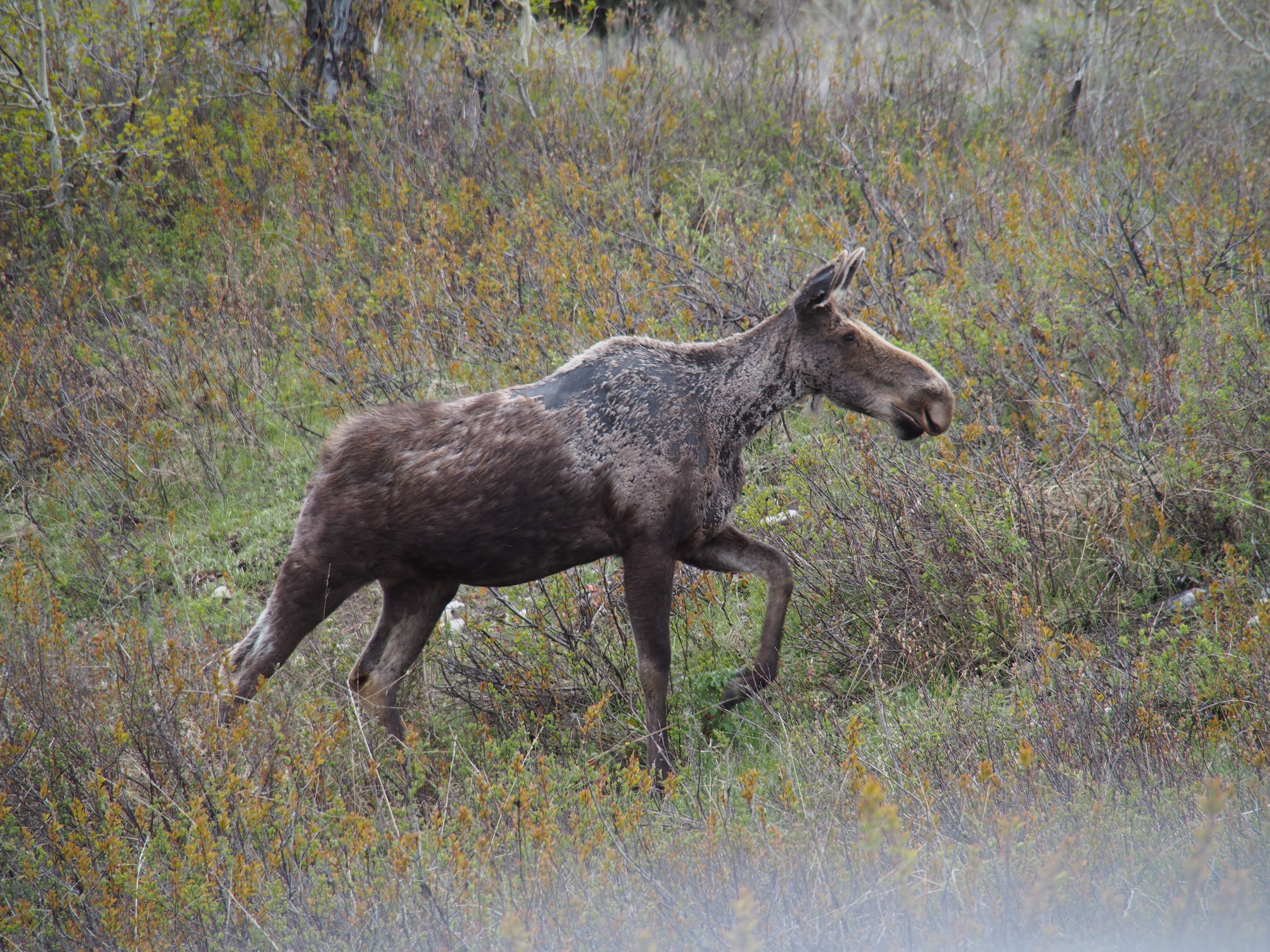 Once again we started out with cold, wet, and cloudy weather, but decided we wanted to try to get some hiking in as it was still clearer than the day before. We went back to Jenny Lake and took a ferry across the 41 degree water to a trail to Hidden Falls and Inspiration Point. Even though it wasn’t perfect, it was a great hike where we almost immediately saw a moose laying just off the trail. There were many places where we the trail was covered in snow. Due to the crowd, we first bypassed the falls to go to Lower Inspiration Point where we found several marmots scampering among the rocks. Even though they didn’t seem to like our presence, I was able to get some good pictures. Heading back down the mountain, we did take the 60 yard, snow covered side trail to Hidden Falls. The view of the 200 foot waterfall certainly didn’t disappoint. With the return of more clouds and rain, we decided to loop back down to Jackson to pick up some propane since the campground was having issues with their equipment. As we left the south entrance of the park, we stopped along the road to watch a moose very near the truck. She seemed to be trying to figure out how to cross the road with all of the cars and ended up passing just in front of ours for some great pictures and video. A great ending to our last full day in Grand Teton National Park.